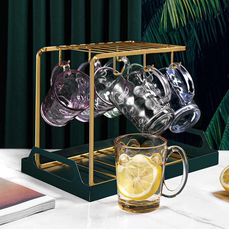 家用玻璃杯套装带杯架泡茶喝水杯子客厅彩色带把茶杯饮料酒杯6只