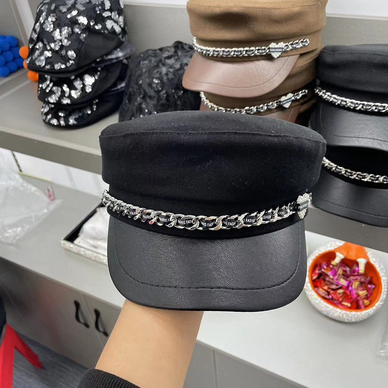 H57 韩版珍珠爱心鸭舌帽女士秋冬百搭链条学生帽英伦经典复古军帽