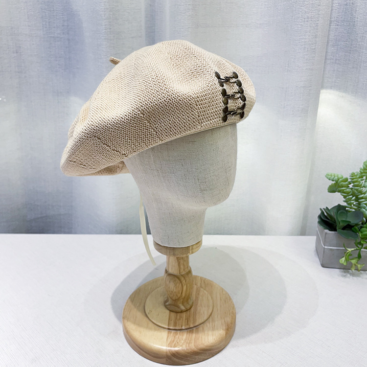 四季款针织贝雷帽女铜扣设计日系学院风休闲帽子女出街遮阳画家帽