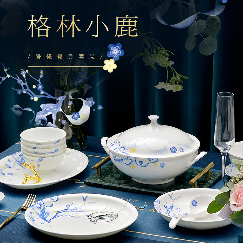 华光陶瓷 碗碟套装家用 骨瓷餐具碗盘套装 釉中彩礼盒装 格林小鹿