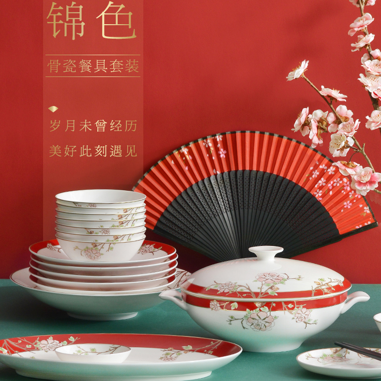 华光国瓷 家用骨瓷餐具碗碟套装 家用中式碗盘餐具套装婚庆 锦色