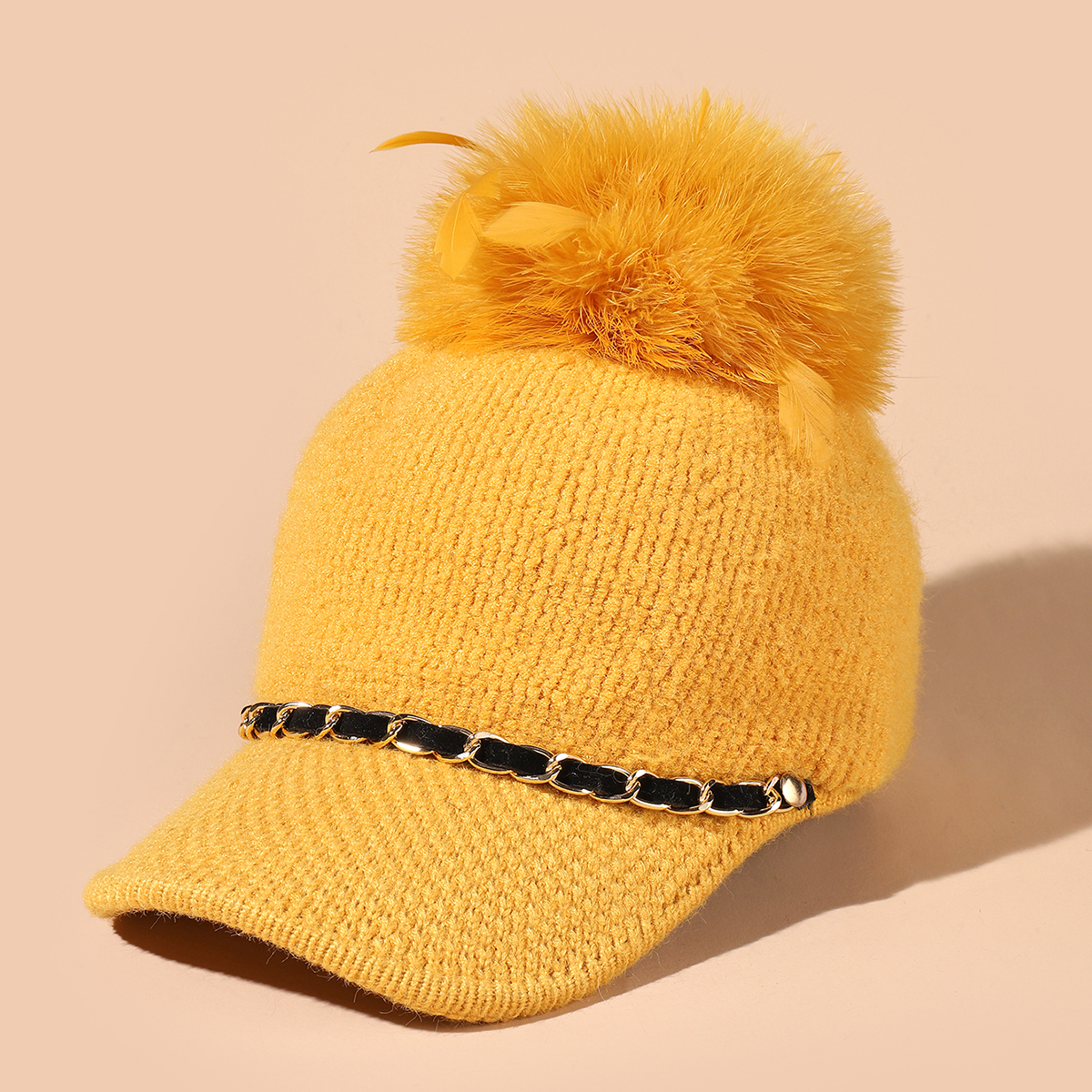 帽子女韩版潮牌秋冬驼毛球皮链时尚针织棒球帽