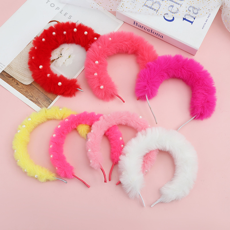一件代发纯色珍珠毛绒头箍发饰 儿童可爱毛球发箍头饰毛绒压发圈