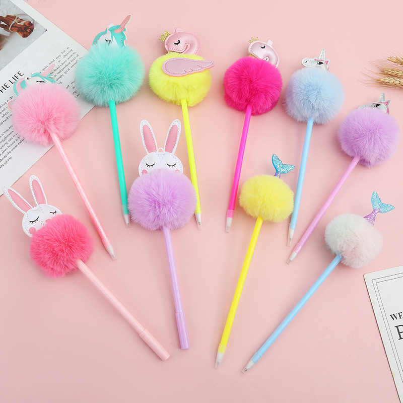 跨境热销韩版卡通PU独角兽毛绒圆珠笔 网红可爱卡通毛球中性笔