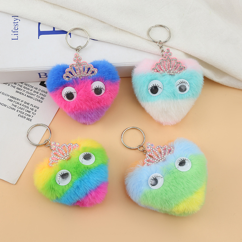 可爱渐变色心形公主皇冠毛绒包包挂饰 仿兔毛毛球装饰包包挂件