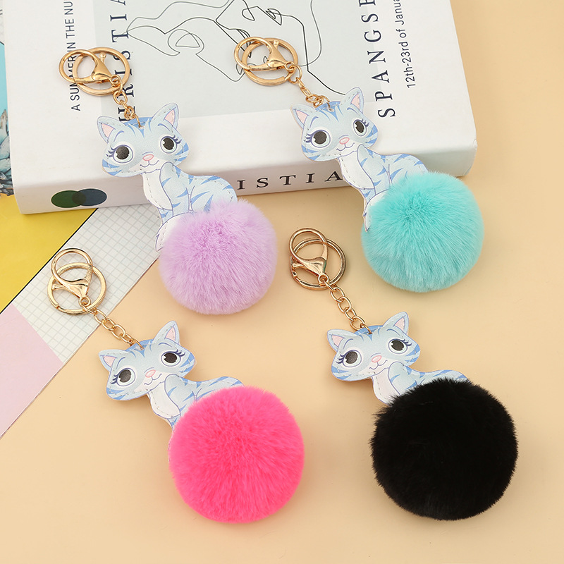 义乌小商品可爱PU小猫毛绒钥匙扣 女式包包手工毛球挂件 包包挂饰