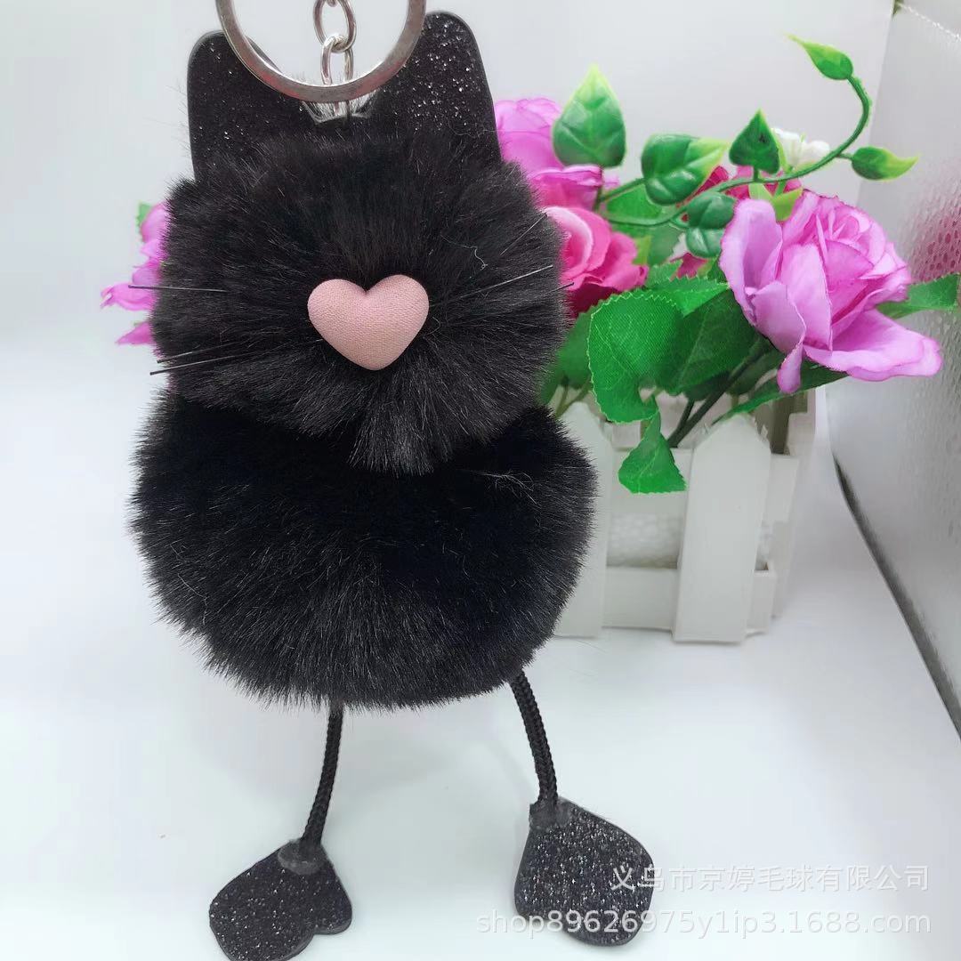 黑色可爱小猫咪毛球包包挂饰 卡通动物仿真毛毛球猫咪钥匙扣挂件