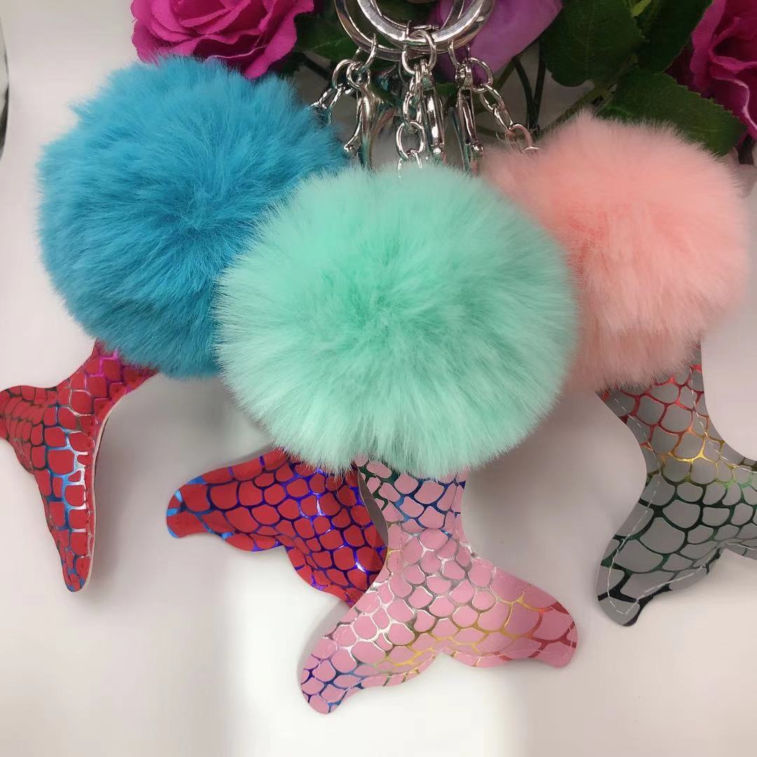 厂家批发创意钥匙扣仿獭兔毛球毛绒冲棉鱼尾箱包挂饰毛球钥匙圈