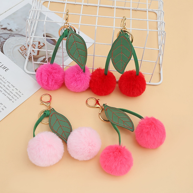厂家创意毛绒樱桃钥匙扣挂件 女士毛球水果包包挂饰 纯色毛球挂件