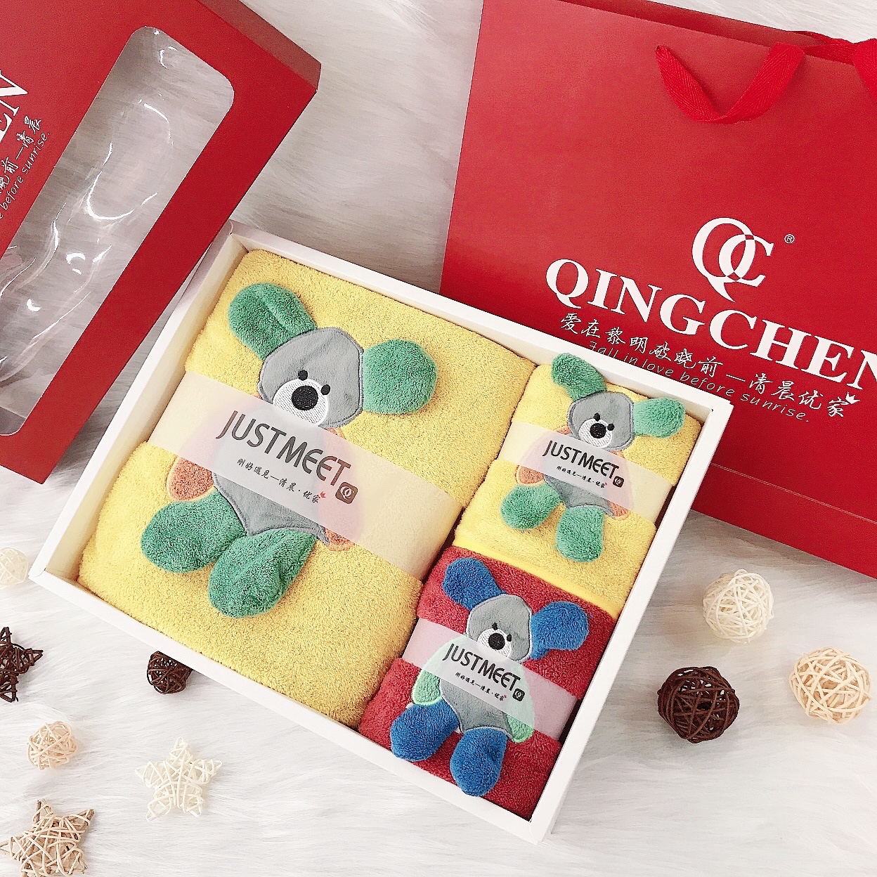 清晨优家憨憨熊超柔吸水毛巾浴巾可爱卡通浴巾毛巾礼盒套装