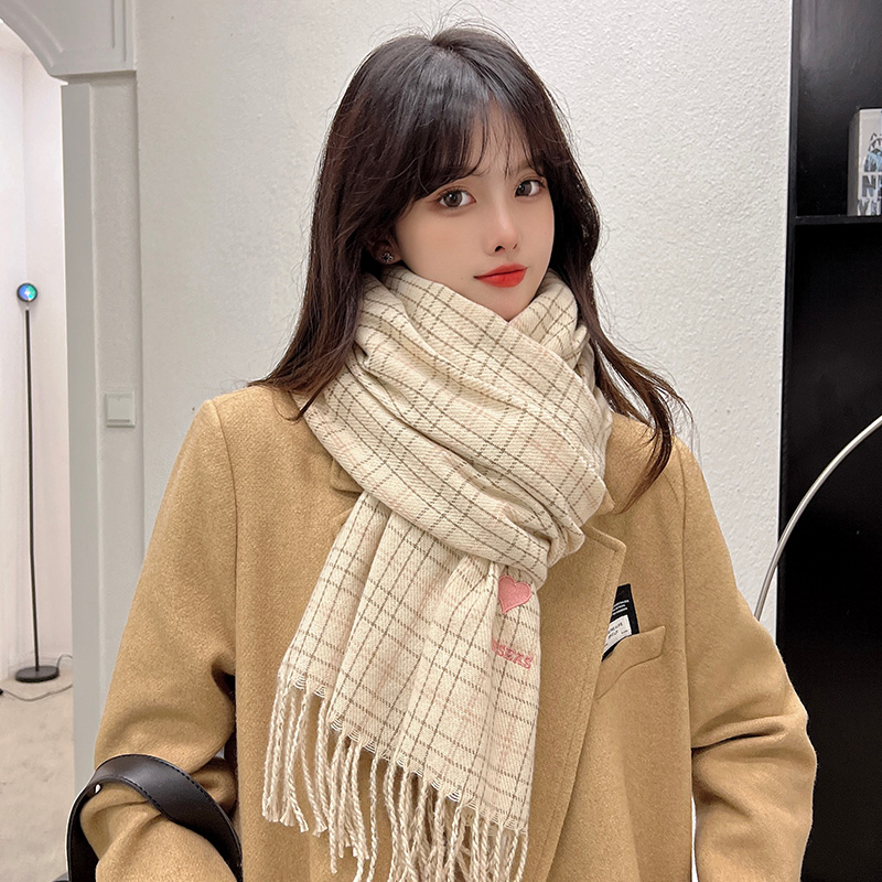 新款格纹刺绣爱心复古围脖韩版学生百搭保暖流苏围巾女秋冬季