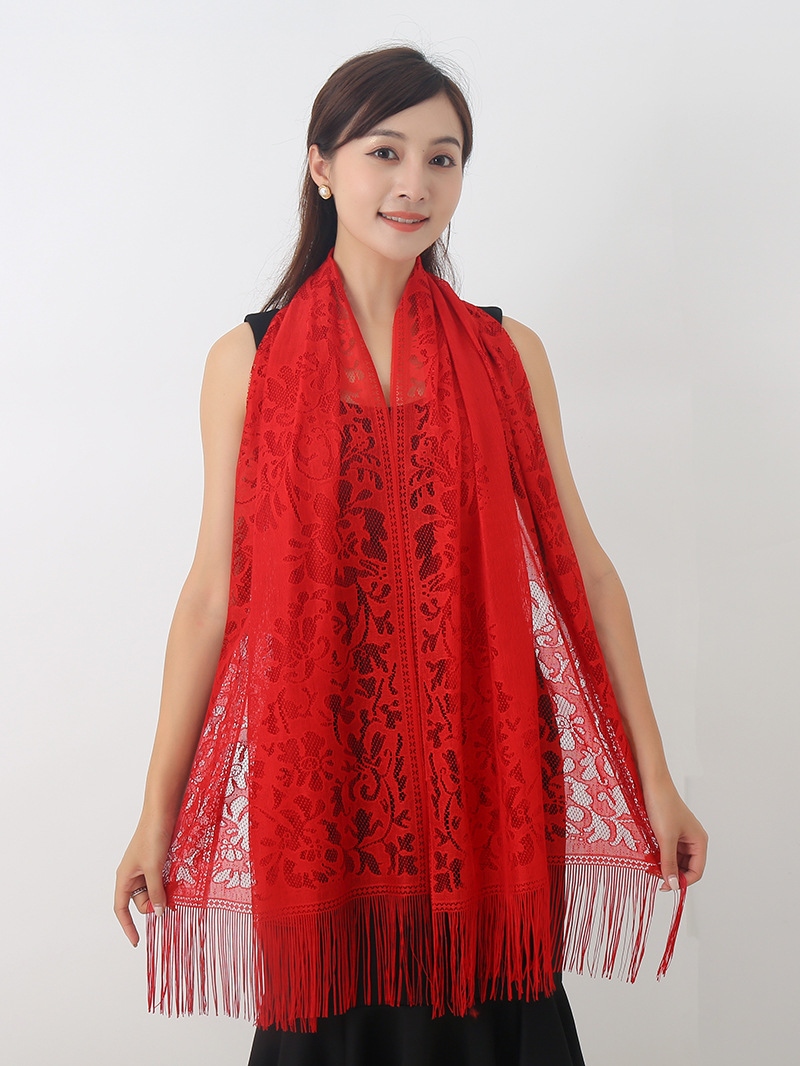 春夏新洋气时尚蕾丝丝巾提花旅游出行佰搭轻薄披肩沙滩巾流苏围巾