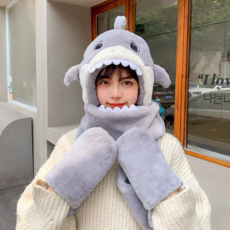 卡通鲨鱼帽子围巾一体男卖萌保暖加绒