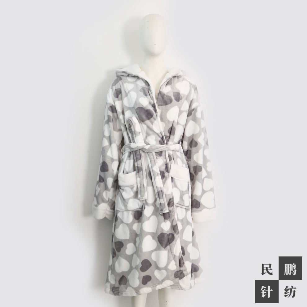 民鹏出品 混色爱心图案秋冬保暖珊瑚绒睡袍睡衣 印花浴袍浴衣均码