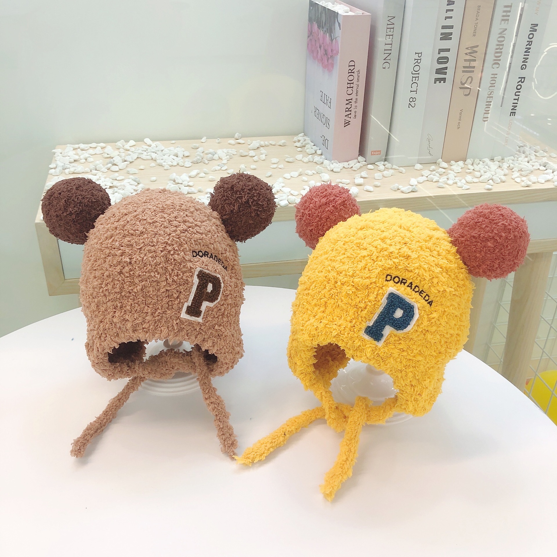 秋冬毛绒保暖帽子婴儿毛球可爱护耳帽系带套头帽儿童加厚帽子