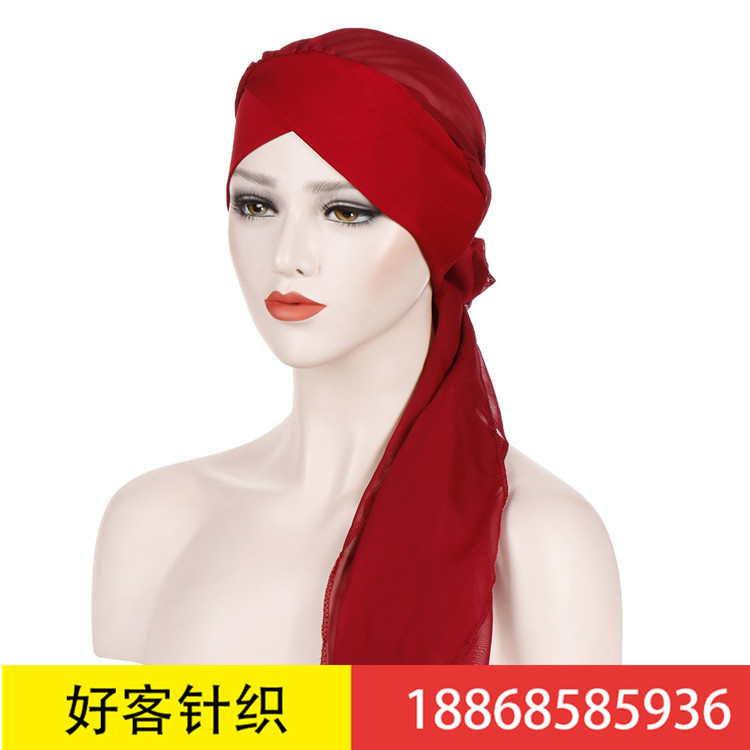 亚马逊新款欧美长尾飘带前额交叉头巾帽纯色时尚雪纺长尾包头帽