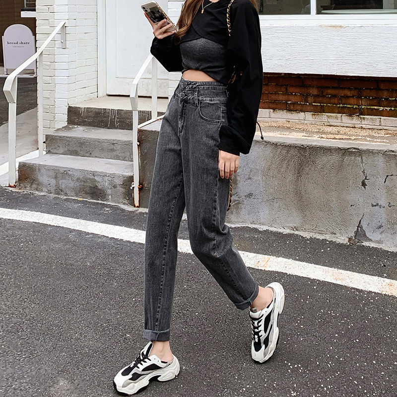 秋冬新款韩版老爹牛仔裤 哈伦裤 萝卜裤加绒 黑色蓝色牛仔裤女