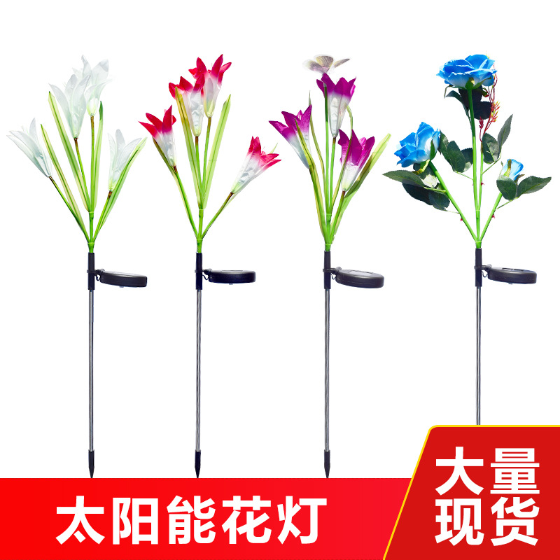 amazon跨境太阳能4头百合花灯仿真户外花园灯LED庭院灯地插草坪灯