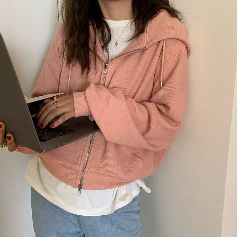 [黄峥]双头拉链螺纹连帽卫衣外套女2020秋季韩版休闲开衫WT78229