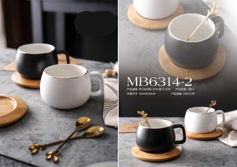 欧式复古描金咖啡杯(黑白+木垫)马克杯陶瓷杯子家用情侣水杯茶杯