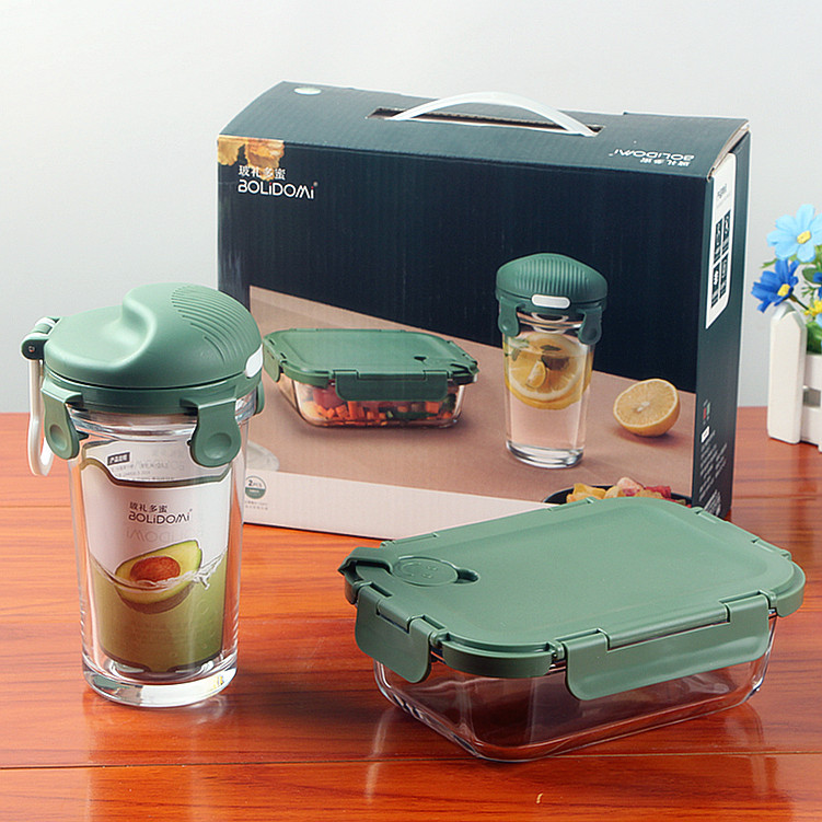 耐热玻璃保鲜碗套装微波炉加热饭盒弹跳水杯两件套活动礼品随身杯
