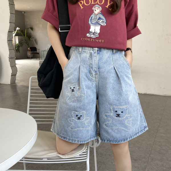 夏季2021新款韩版牛仔短裤女潮薄款宽松高腰显瘦刺绣阔腿裤子女装