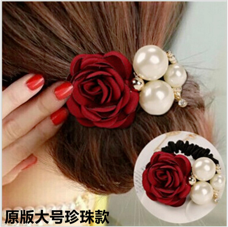 福卓鸟韩版时尚发饰大珍珠玫瑰花朵发圈山茶花发绳头饰镶钻皮筋