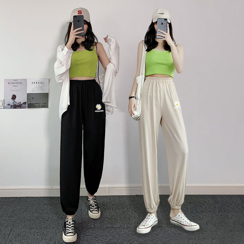 2020秋季新款小雏菊高腰裤女薄款弹力宽松外穿束脚卫裤运动休闲裤