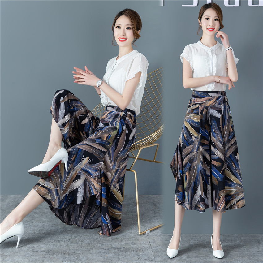 2021春夏季碎花a字裙半身裙裤绵绸中老年阔腿裤女士九分裤中长款