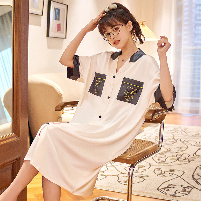 夏季男友风冰丝睡衣女仿真丝日系可爱卡通丝绸开衫家居睡裙居家服
