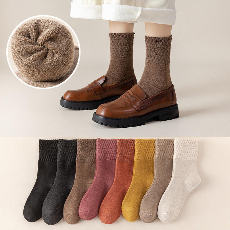 冬季棉质女士袜子加厚保暖地板袜纯色毛圈袜日系加绒月子中筒袜