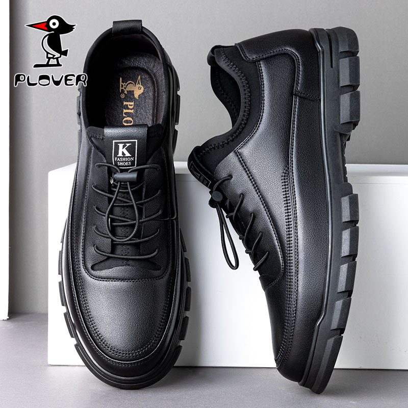 plover二层牛皮男低帮休闲皮鞋耐磨圆头纯色日常厚底鞋一件代发