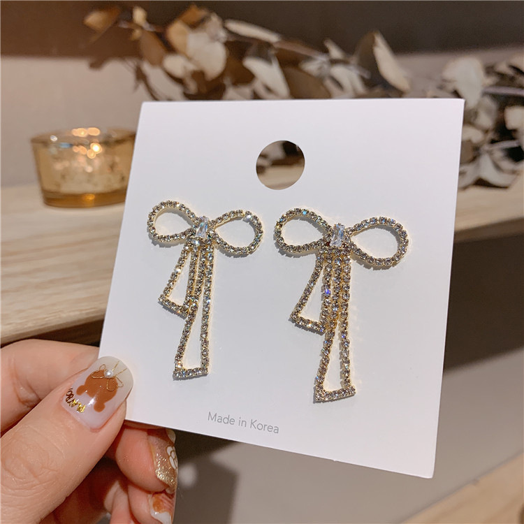S925银针韩国东大门水钻珍珠蝴蝶结耳环女网红气质超仙耳坠耳饰品