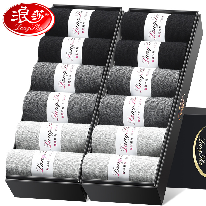 浪莎男士纯棉袜子6双礼盒装 四季款透气吸汗商务休闲中筒短袜代发
