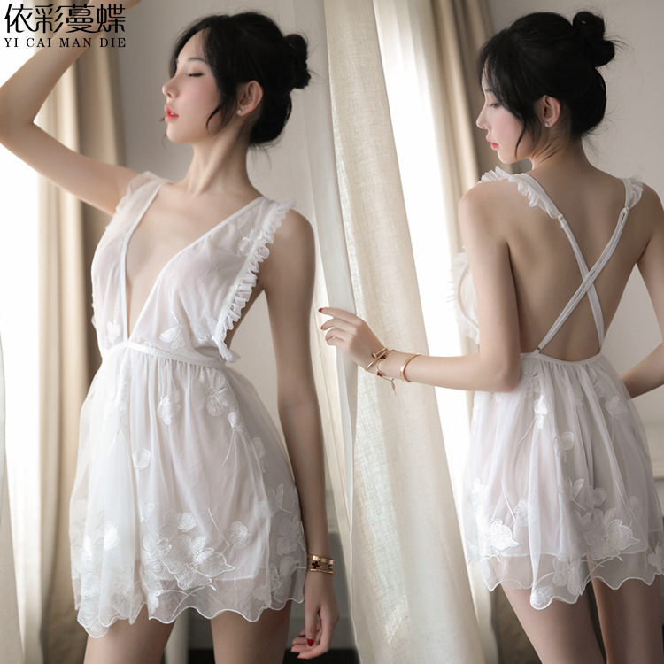 外贸新款情趣内衣蝴蝶刺绣花女性感吊带睡裙清新诱惑套装批发代发