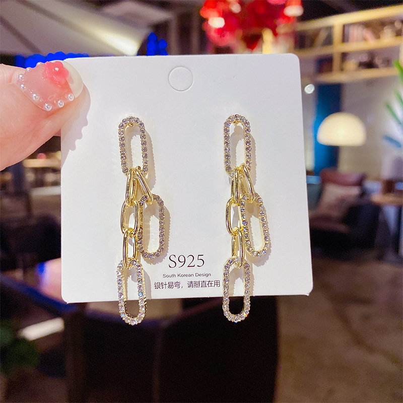 气质时尚设计感满钻链条耳环个性网红耳钉超仙长款S925银针耳饰链