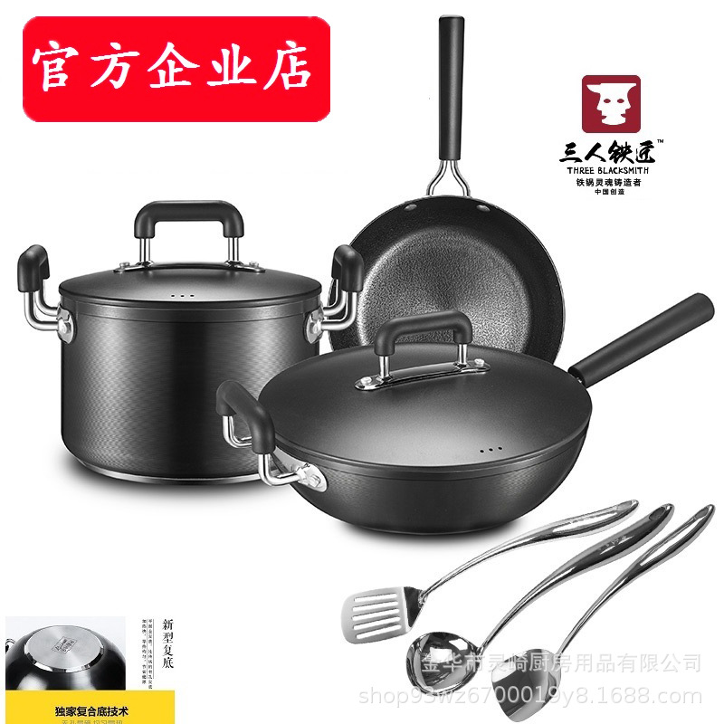 三人铁匠无涂层锻打冰裂纹全复底3件套(炒锅+汤锅+煎锅)