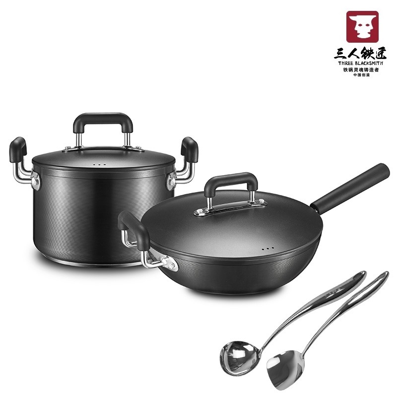 三人铁匠无涂层电磁炉24cm汤锅32炒菜锅组合两件套装家用煤气灶