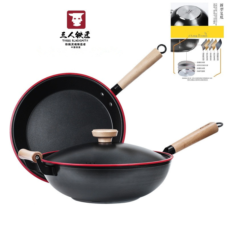三人铁匠32cm组合套装铁锅不粘锅无涂层电磁炉煎锅炒锅平底锅家用