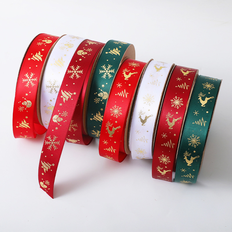 2021跨境新品圣诞丝带包装彩带烫金印刷螺纹带圣诞节织带现货批发