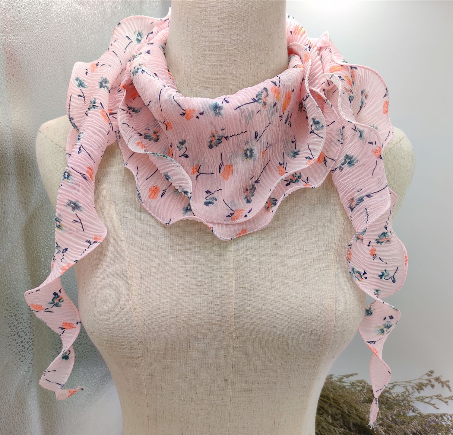 现货女花卉粉色菱形巾印花装饰经编秋季压皱丝巾围巾女