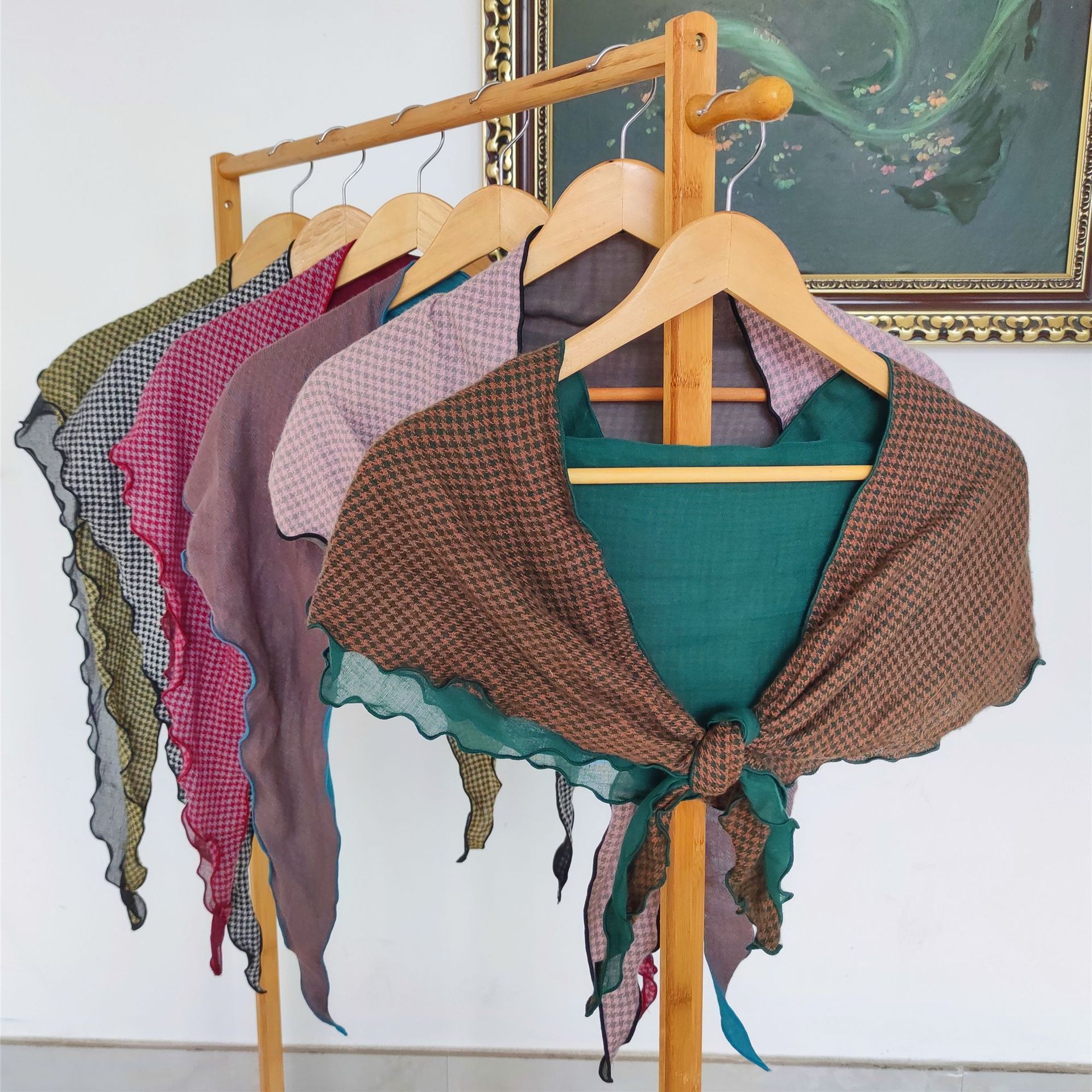 秋千鸟格菱形女冬季装饰缎纹双层现货绿色格子流苏围巾女披肩