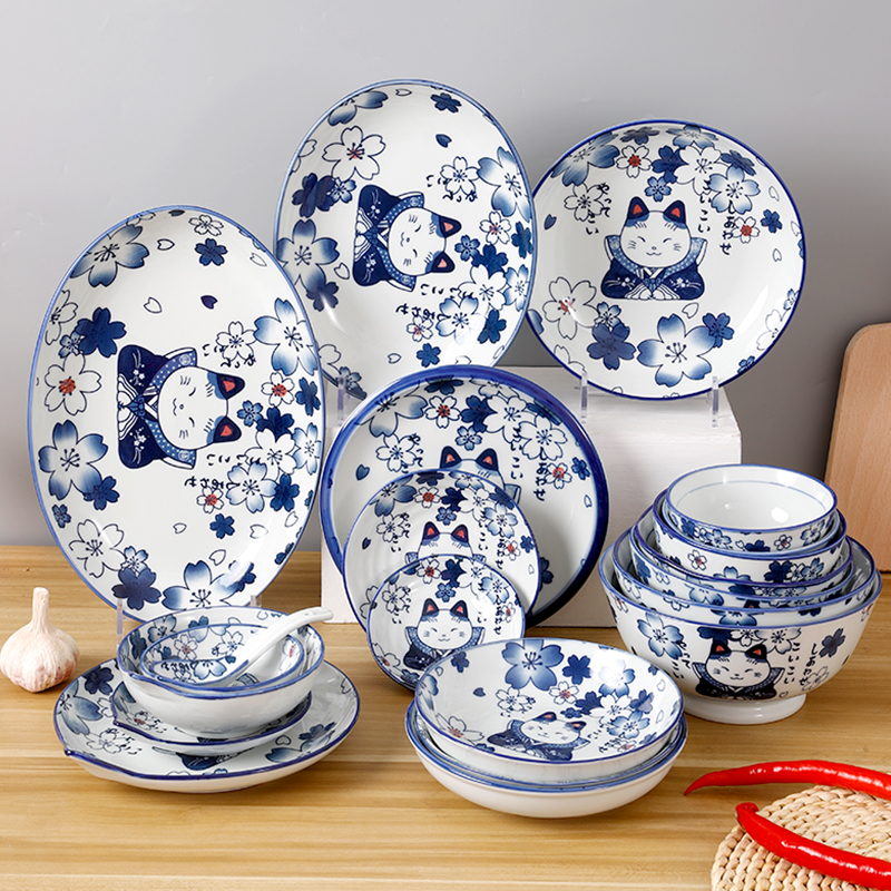 日式樱花猫陶瓷碗盘子家用餐具碗盘碟套装礼品