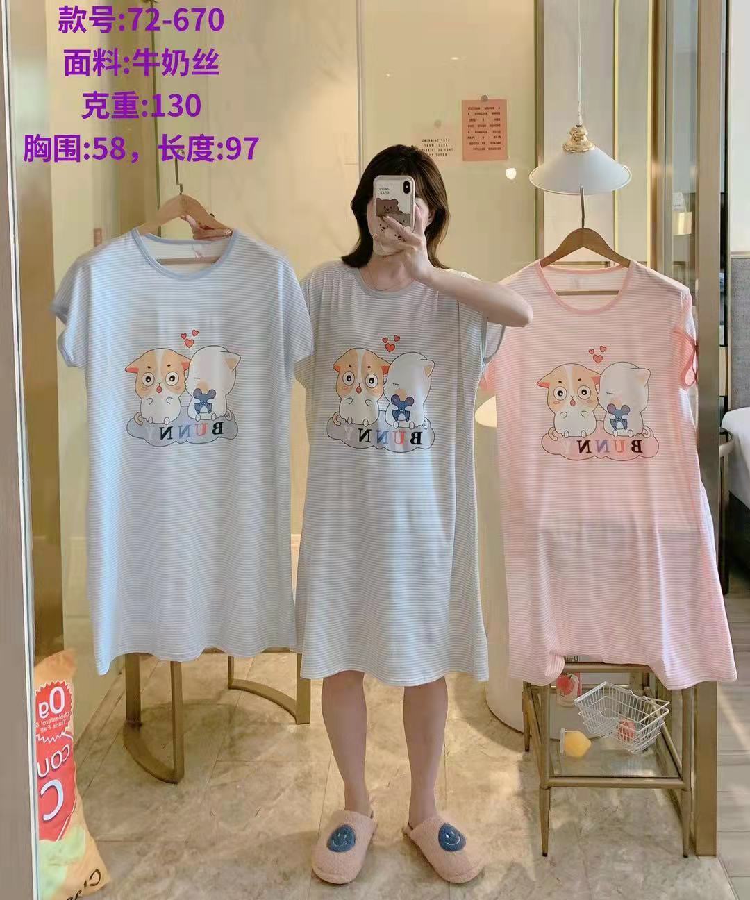 可爱卡通印花条纹牛奶丝短袖睡裙夏季睡衣