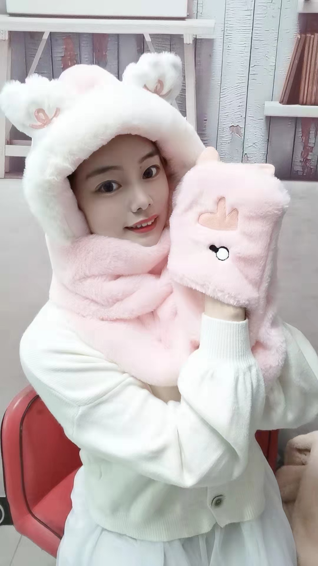 帽子女秋冬季百搭小兔耳朵毛绒可爱手套围巾一体骑车保暖三件套潮