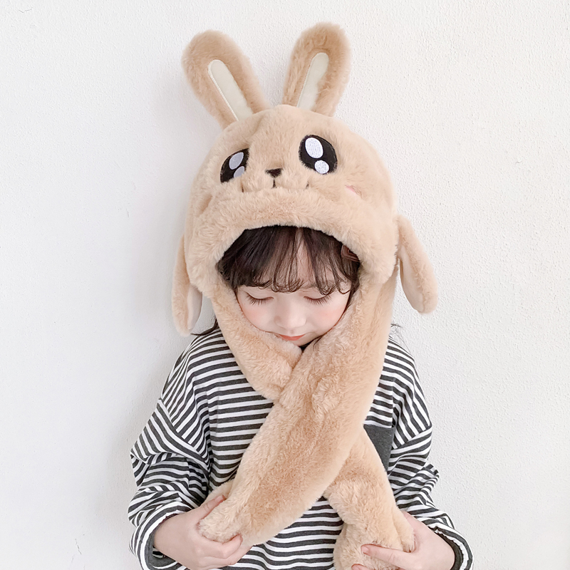 儿童毛绒护耳帽子宝宝男女童可爱兔子一捏会动保暖帽围巾一体秋冬