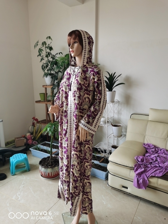 外贸中东阿拉伯非洲穆斯林镶花边带帽女士印花大袍