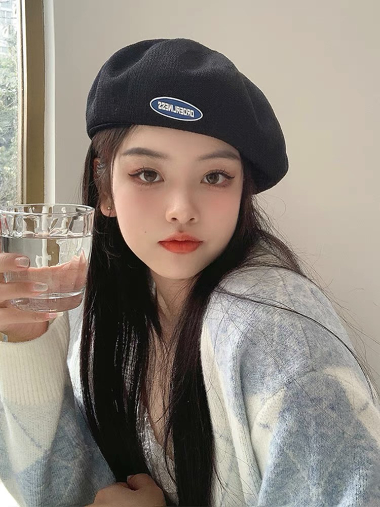 网红黑色针织贝雷帽女春秋款大头围帽子夏季百搭画家帽秋冬毛线帽