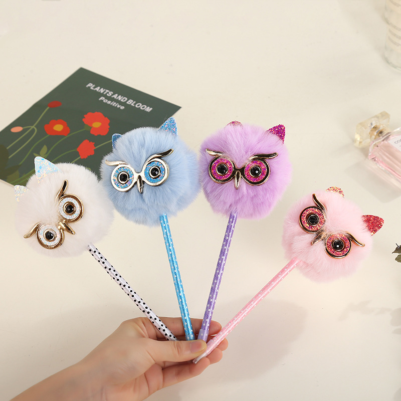 韩版大热可爱卡通猫头鹰毛球挂件中性笔少女心学生创意笔