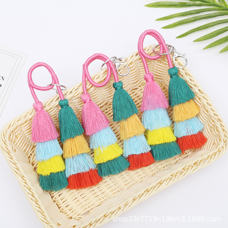 欧美时尚手工编包挂件七彩棉线流苏穗子挂件彩色层次流苏钥匙扣